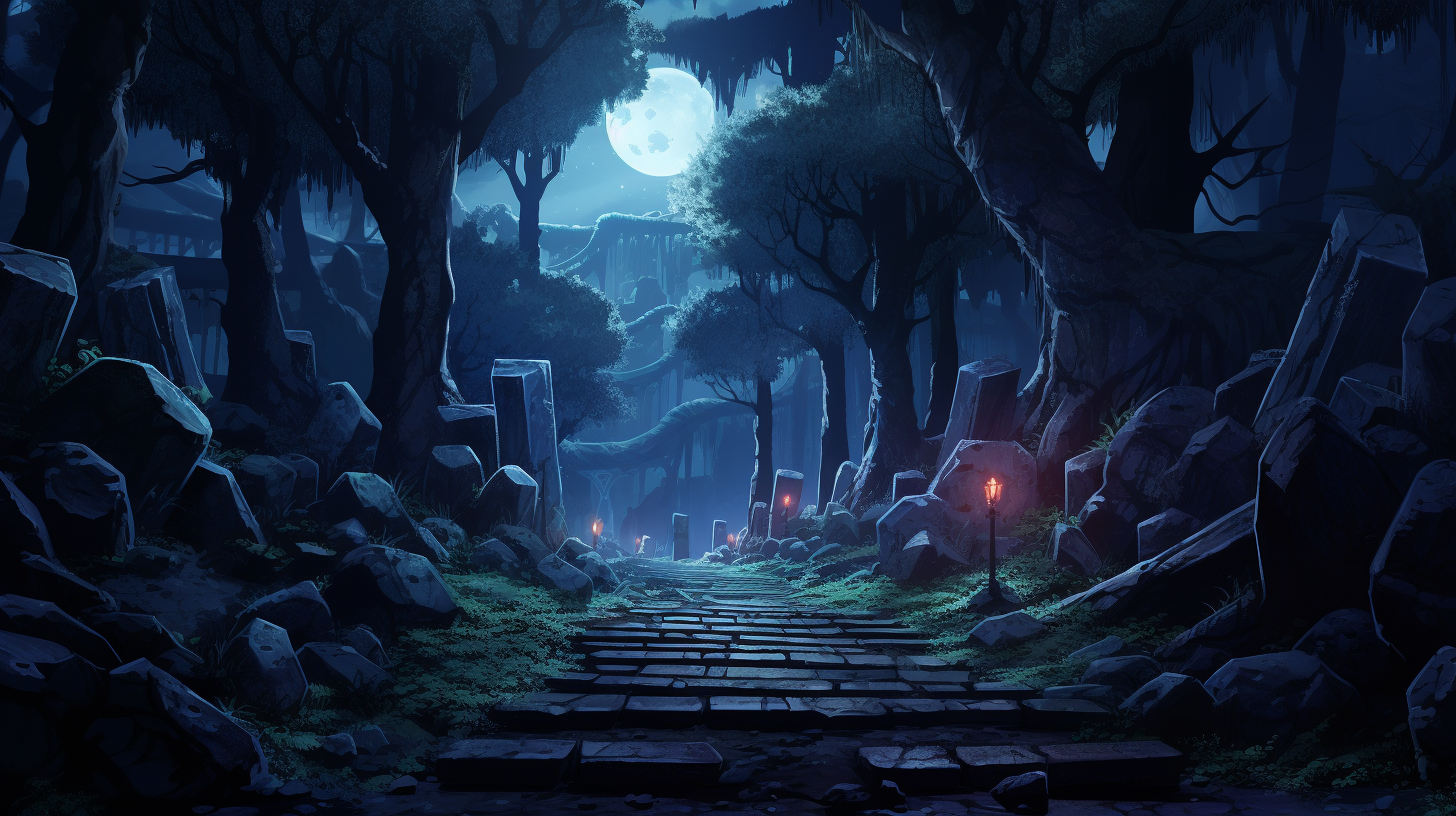 background illustration of an anime film by studio ghibli studio Ghibli, a forest with stone structures by night time and moonlight --ar 16:9